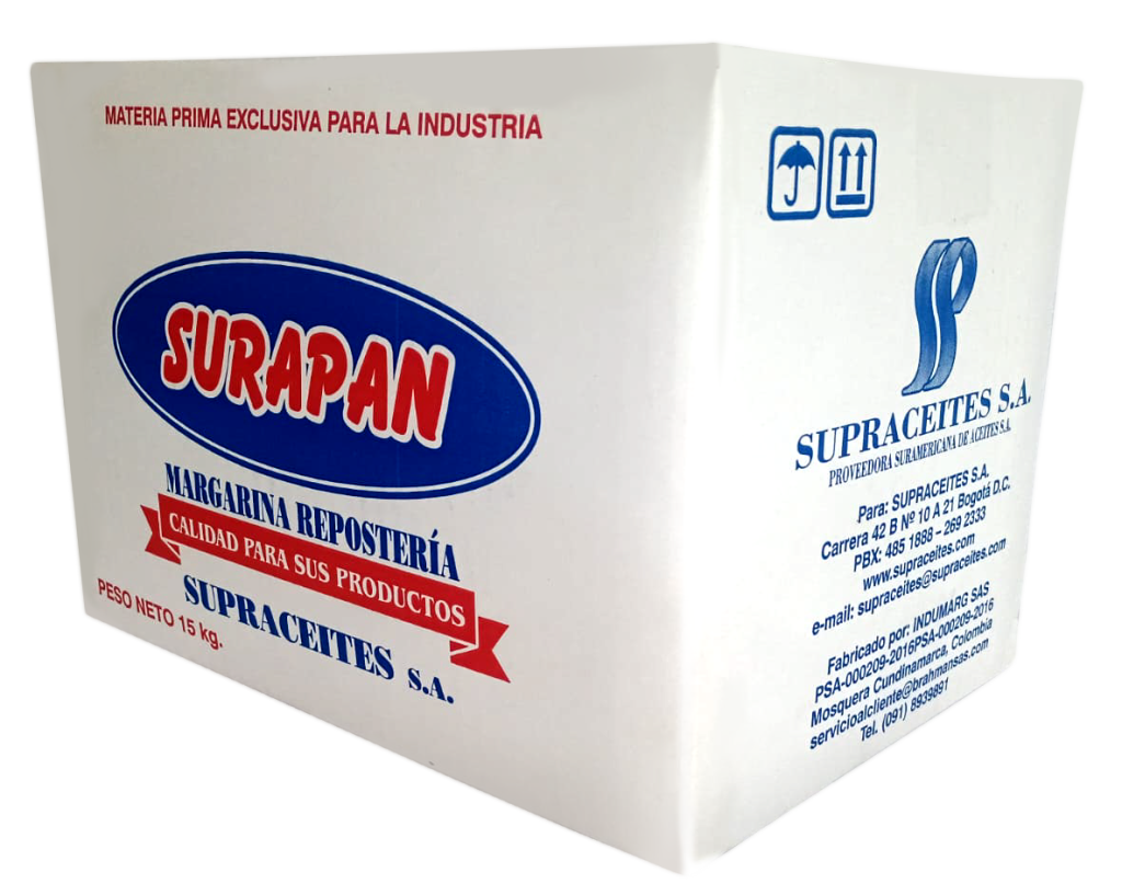 La margarina Surapan multipropósito viene en bloque de 15 Kg, empacado en una bolsa de poilietileno que preserva la frescura del producto, para facilitar su transporte y almacenamiento está protegido por un cartón corrugado resistente, sellado con cinta adhesiva